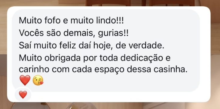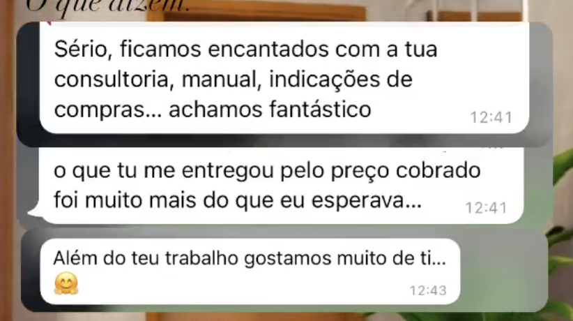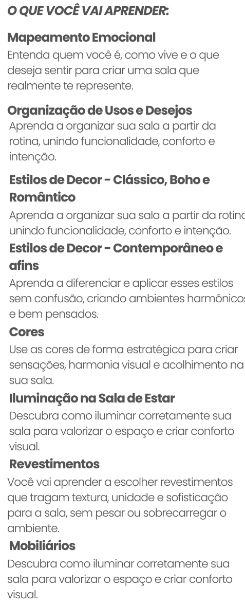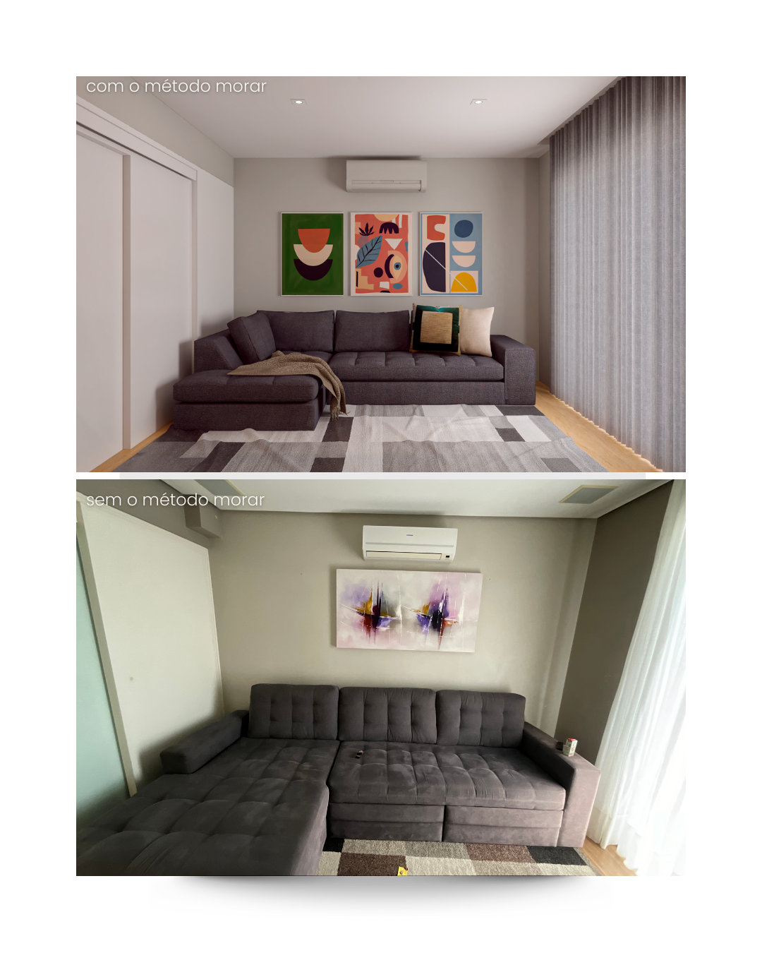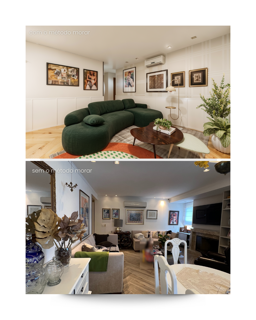 Você ganha clareza emocional e estética. As decisões ficam mais seguras, conscientes e possíveis, e a decoração passa a fazer sentido. Sua sala te acolhe, funciona melhor e finalmente representa quem você é.